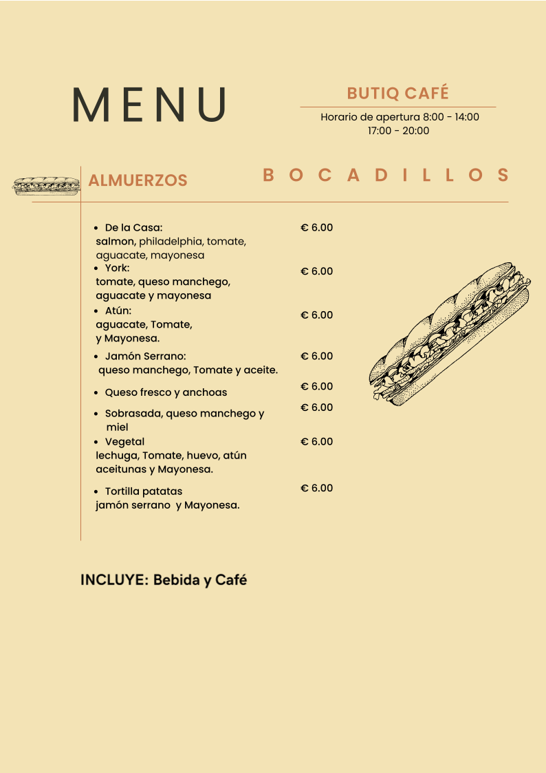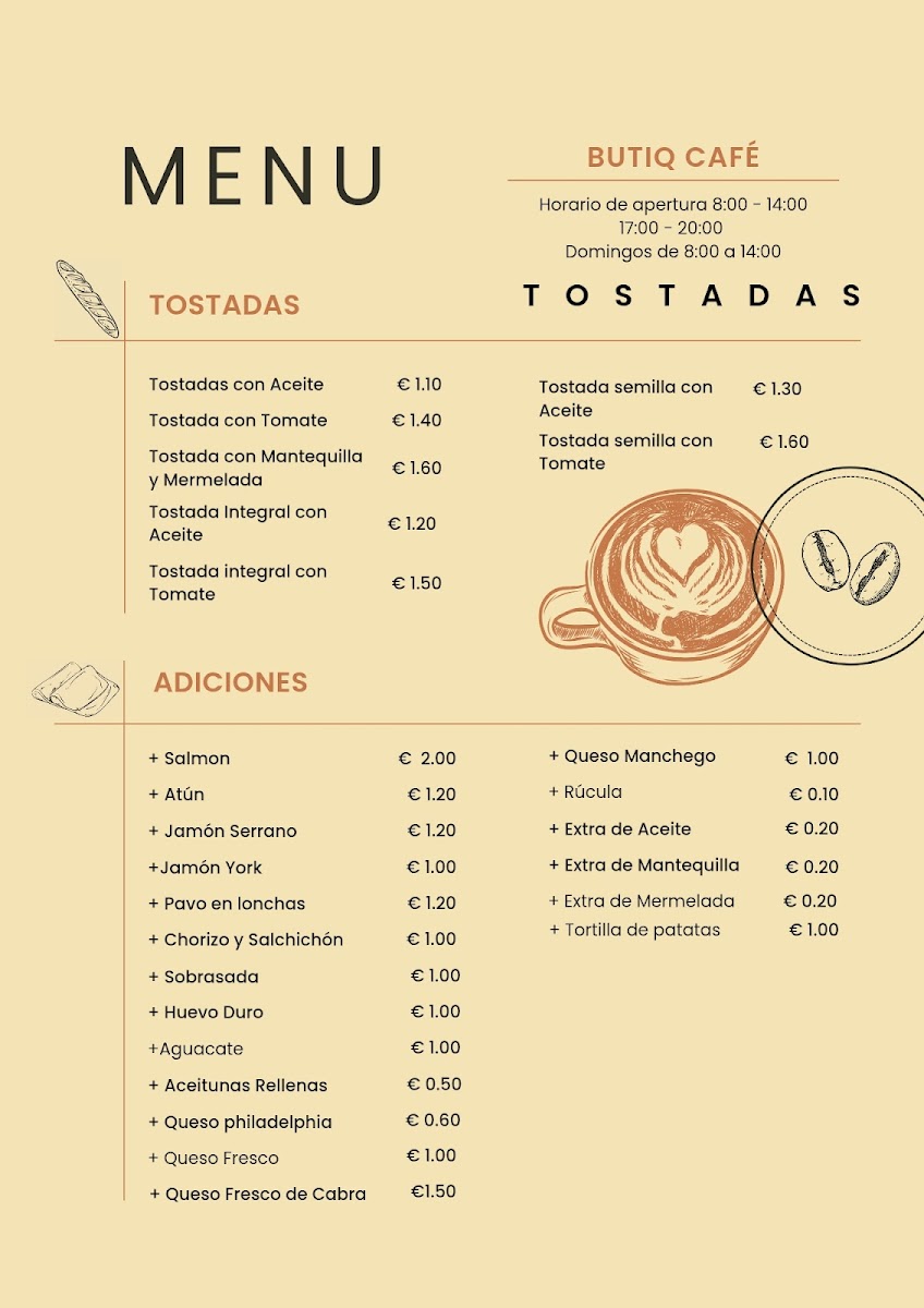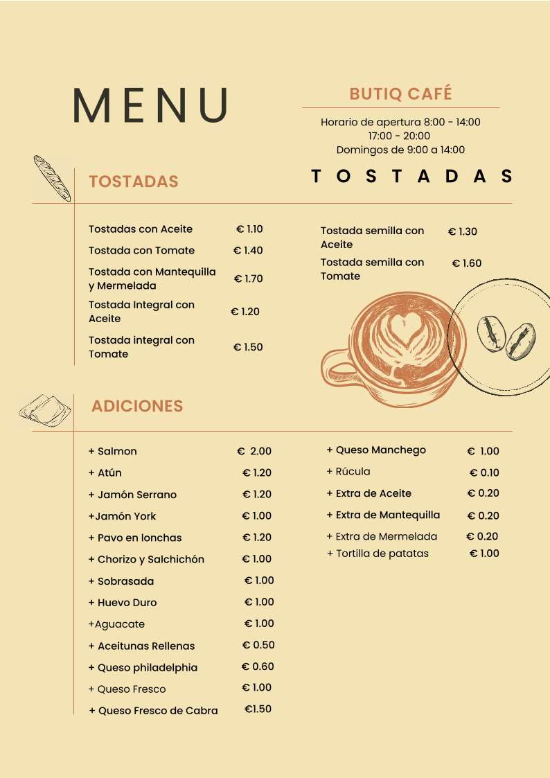 The menu offers a selection of coffee beverages and light food options suitable for breakfast, coffee breaks, and casual dining throughout the day. Drink choices include espresso-based coffees such as espresso, cappuccino, Americano, and specialty coffees like red velvet and cappuccino aroma. Light food items commonly complement coffee, featuring pastries such as napolitana.